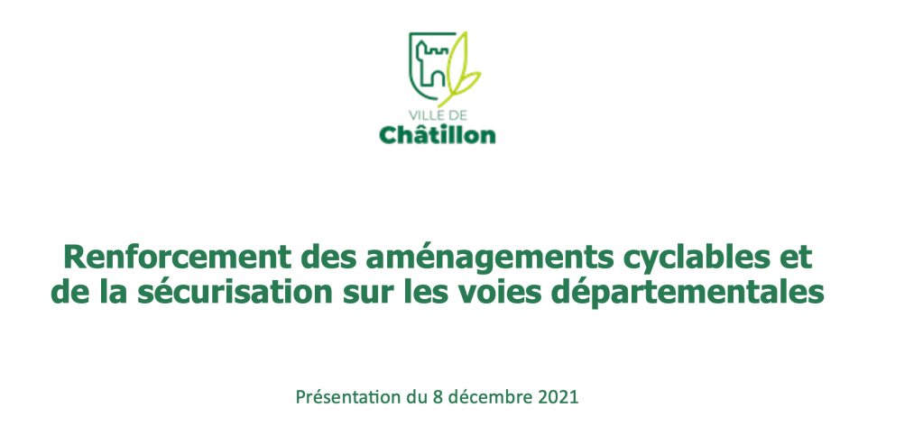 Le 8 novembre 2021, a eu lieu une réunion avec les services de la mairie de Châtillon, les services du département, Elodie Dorfiac, 1ère adjointe, Transition écologique, mobilités, espaces verts, Andy Ankoud, Conseiller municipal délégué de la majorité, Transport, mobilités et coulée verte, Lounes Adjroud, conseiller départemental et moi.