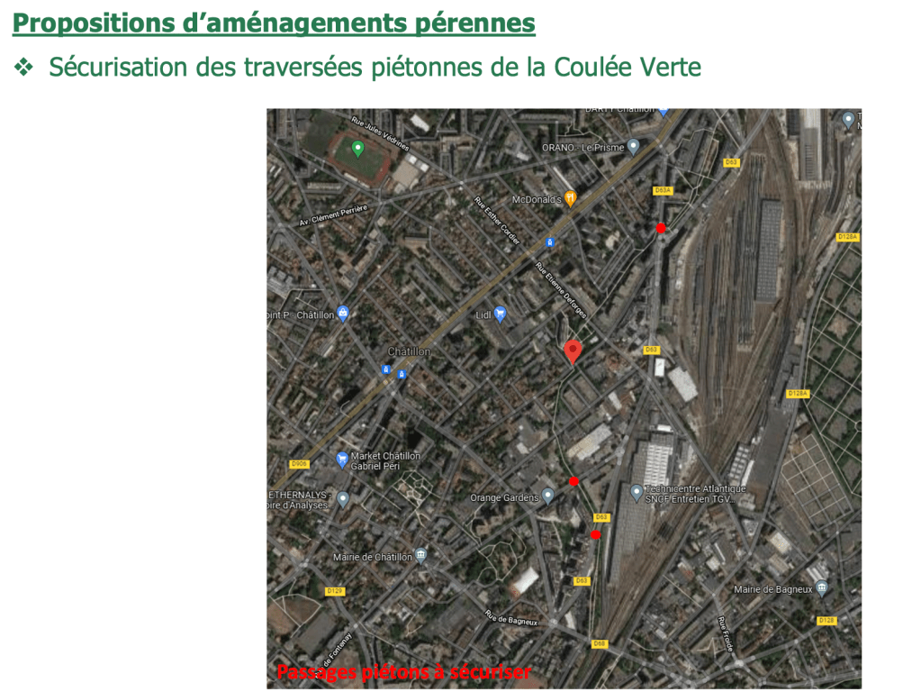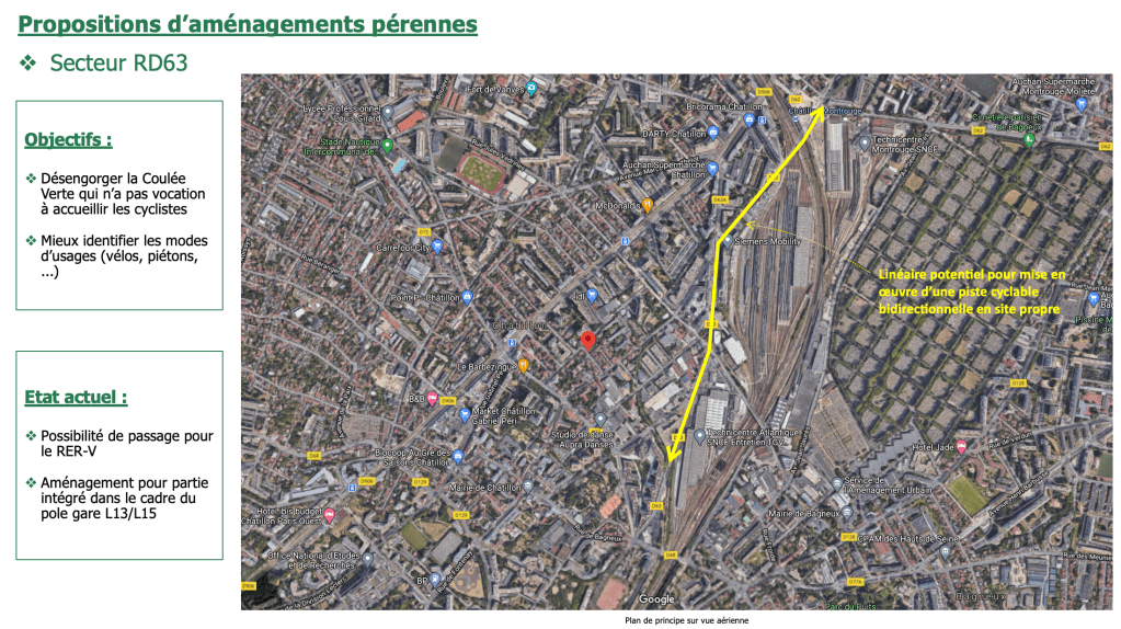 Nous avons mentionné les aménagements possibles, notamment pour sécuriser l’axe RD 63 sachant que la Coulée Verte n’a pas vocation à être un axe pour vélo utilitaire du fait de son caractère mixte piéton/vélo. Il est donc nécessaire de créer des aménagements cyclables sur la route départementale 63 pour permettre la réalisation de la ligne B3 du RER V qui passera par Châtillon, Bagneux, Sceaux et Antony.