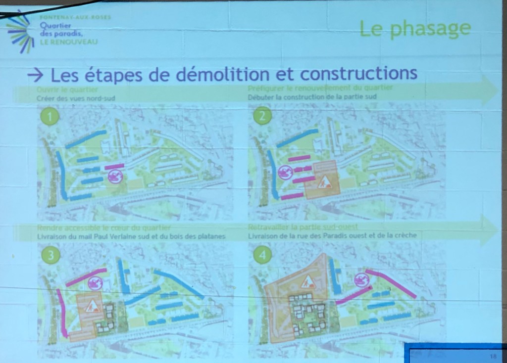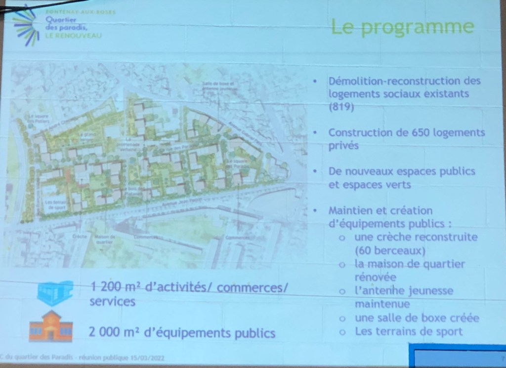 Introduction par Laurent Vastel, maire et Damien Vanoverschelde, directeur général de Hauts-de-Seine Habitat qui ont rappelé la première phase, avec démolition et le relogement et la prochaine phase de démolition de la moitié de la « barre » des paradis avec la volonté d’avancer de façon simultanée. Ils ont indiqué qu’il y a peu de gens mécontents des relogements.