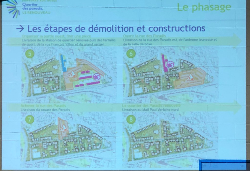Les critères de priorisation sont le handicap, la famille monoparentale, l(les) enfant(s) scolarisé(s). J’ai posé la question de l’âge des habitants puisqu’un déménagement quand on est âgé peut être source de déracinement et a fortiori d’inquiétude quant on ne connaît pas la date même approximative de déménagement. Laurent Vastel a répondu que « les peurs sont légitimes et on peut les multiplier à l’envie, .. la solution cela serait de ne rien faire… On sera là ».
