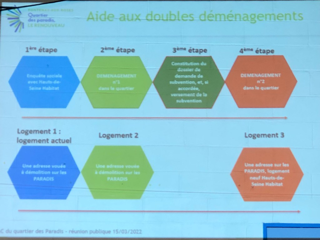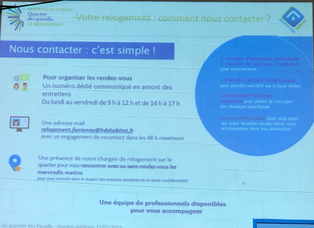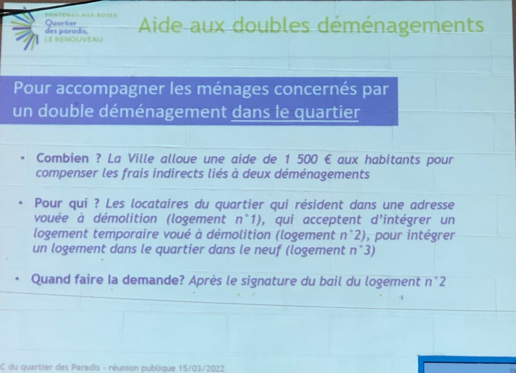 - la prime de 1 500€ : est-elle possible pour ceux qui quittent Fontenay mais qui souhaitent finalement revenir ? Laurent Vastel indiqué qu’il souhaitait favoriser les personnes qui veulent rester dans le quartier mais pas hostile à ceux qui veulent partir à l’extérieur et qui reviennent et a conclu par « je pense qu’on va le faire ».