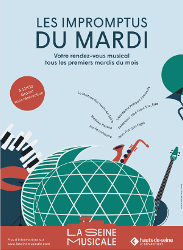 Dans le cadre du dispositif « Les Impromptus du mardi », le Département des Hauts-de-Seine propose un rendez-vous musical gratuit tous les premiers mardis du mois, le midi dans les différents espaces de La Seine Musicale et sur le Parvis.