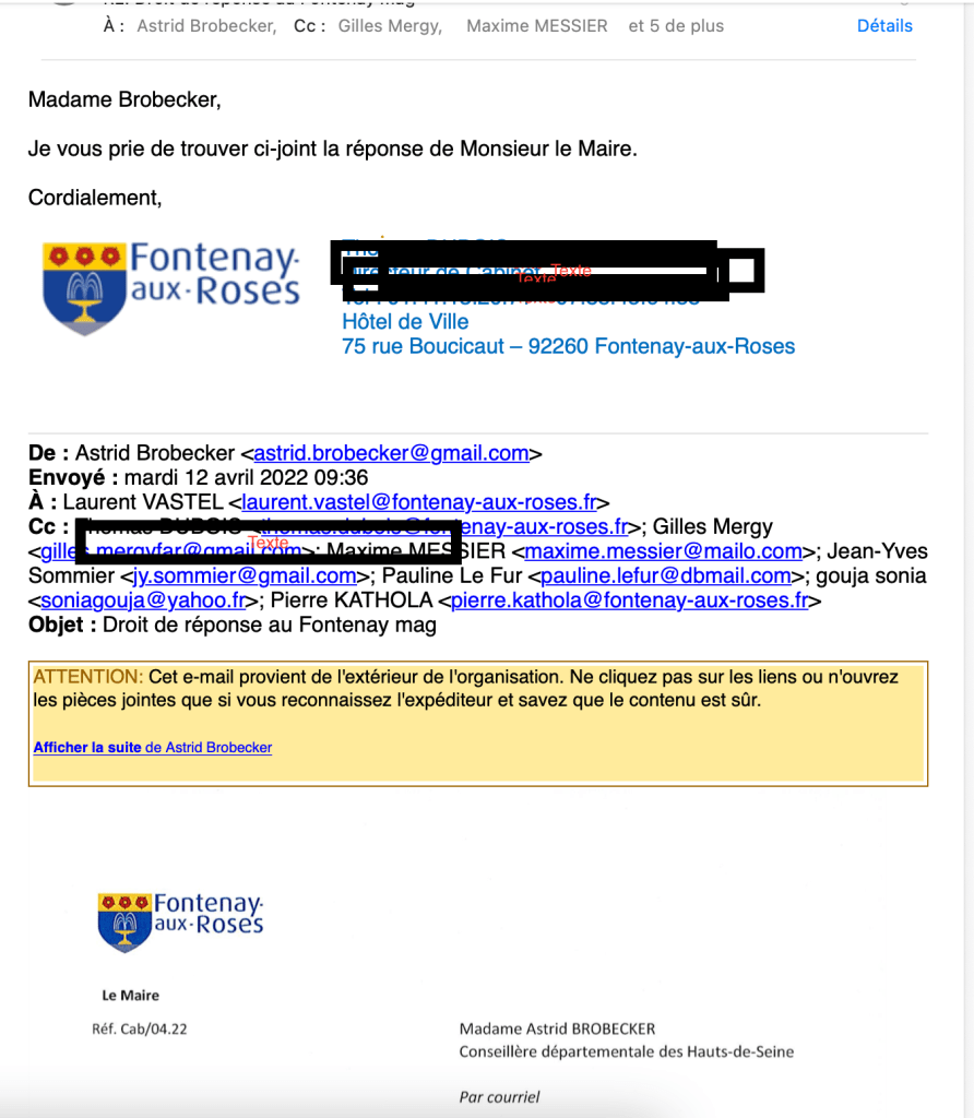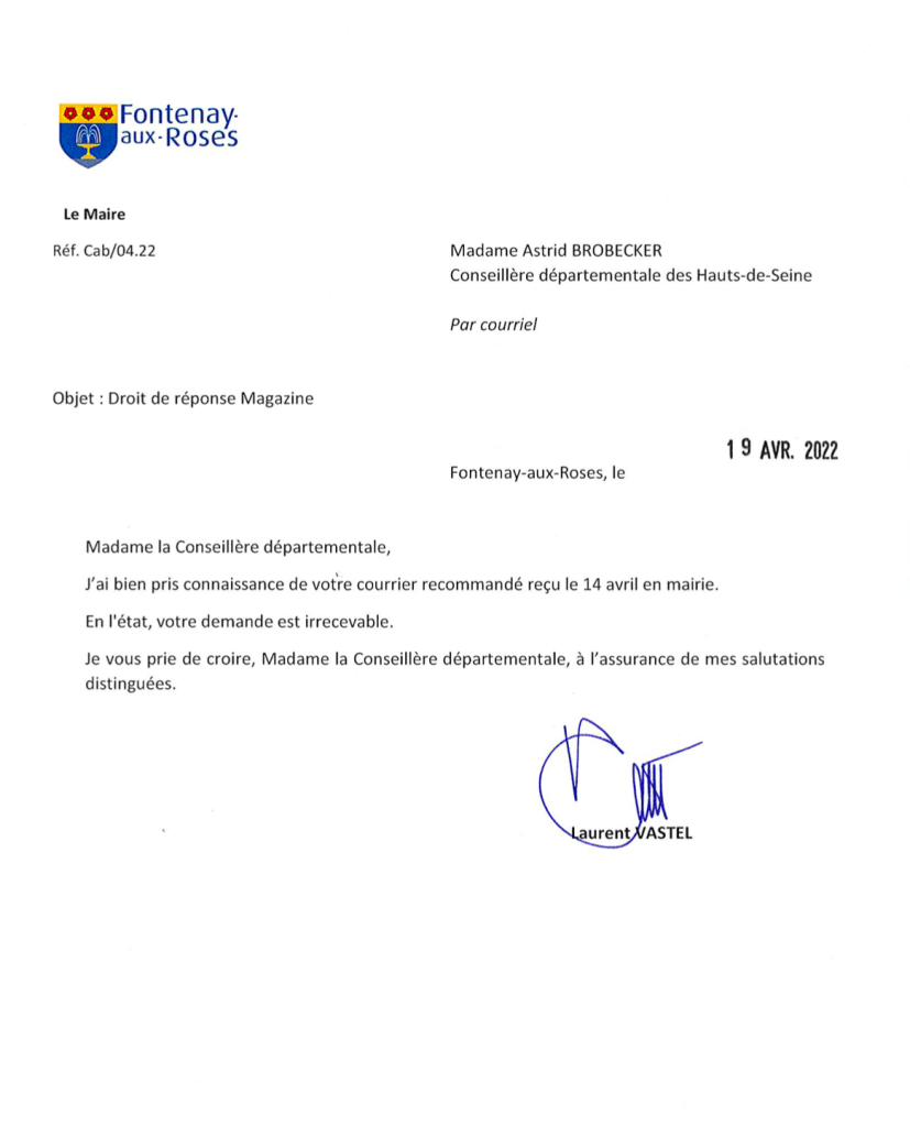 Le maire de Fontenay-aux-Roses, dans son édito dans le FAR mag, a indiqué « malgré le fait que notre nouvelle conseillère départementale ait fait le choix d’une opposition radicale et idéologique au Département comme au Conseil municipal, et que de ce fait elle ne soit associée à aucun dossier ».
