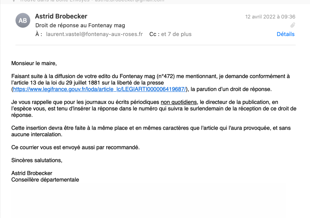 J’ai donc demandé un droit de réponse conformément à la loi du 29 juillet 1881 sur la liberté de la presse, le 12 avril 2022.