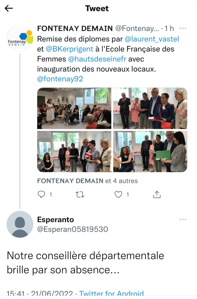 Ensuite sur twitter, mensonges et médisances : Esperanto (pseudo d’une élue de la majorité qui s’est calmée officiellement sur twitter mais continue sous pseudo… en passant d’Akira à Esperanto).