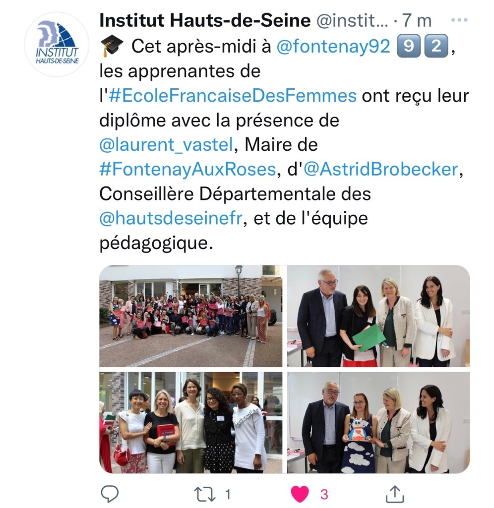 Les apprenantes ont reçu leur diplôme et un livre offert par l’Institut des Hauts-de-Seine. Félicitations à elles, à leurs professeurs, à Cindy Doré coordinatrice, à Isabelle Russo Sandford, directrice des écoles françaises des femmes et à Bénédicte De Kerprigent, Directrice Générale et fondatrice de l’Institut des Hauts-de-Seine.