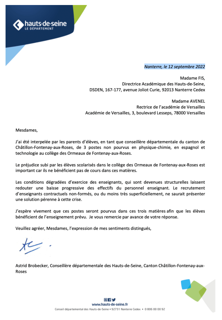 J’ai écrit à Madame Fis, directrice Académique des Hauts-de-Seine et à Madame Avenel, Rectrice, ce jour, pour leur demander quand les postes seront pourvus dans ces trois matières afin que les élèves bénéficient de l’enseignement prévu.