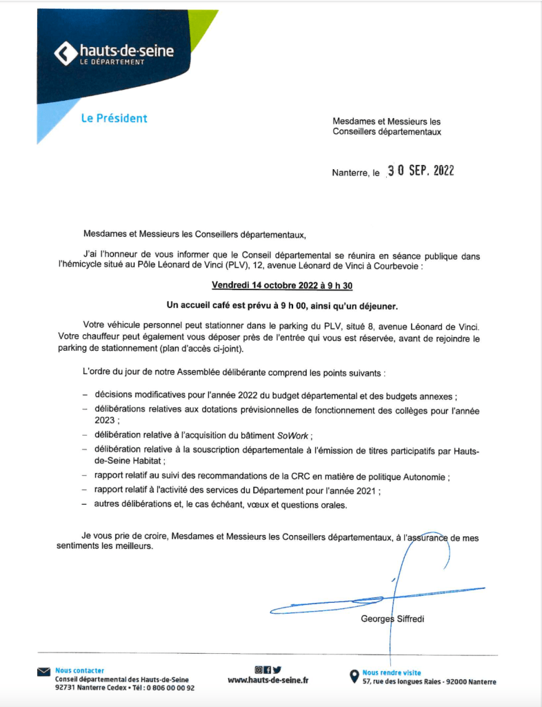 Nous venons de recevoir la convocation de Monsieur le Président à la séance publique du 14 octobre prochain.
