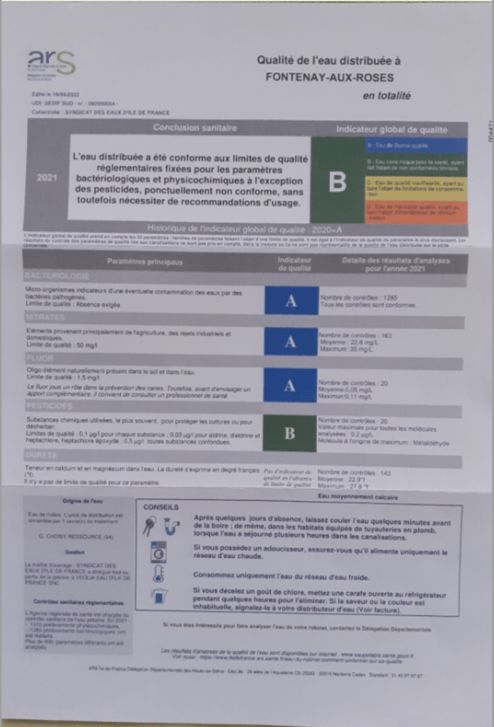 A Fontenay-aux-Roses ; l’eau distribuée est notée B donc conforme aux limites de qualité réglementaire fixées par les paramètres bactériologiques et physicochimiques à l’exception des pesticides, ponctuellement non conforme.