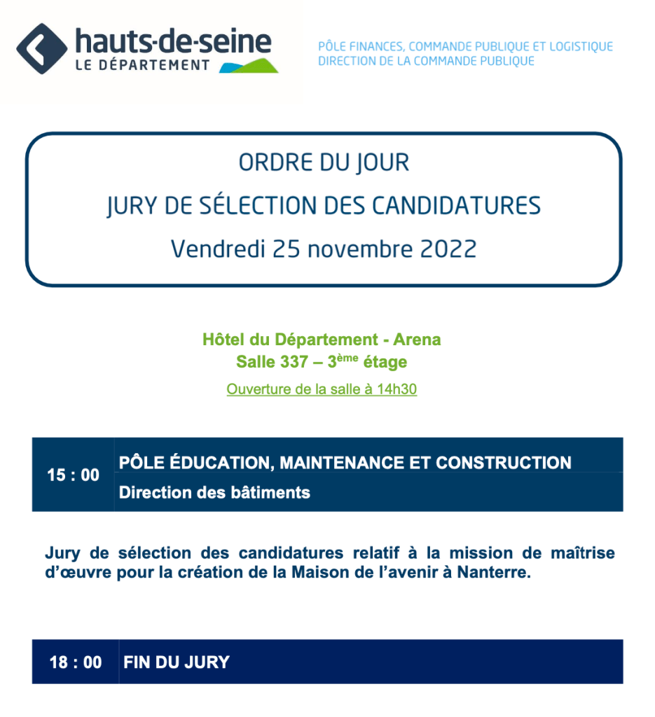 « Le Département des Hauts-de-Seine souhaite créer un lieu d’accueil de jour et de nuit innovant pour améliorer l’accompagnement des adolescents confiés à l’aide sociale à l’enfance (ASE). À cet effet, il s’est associé à des experts en la matière afin de définir un équipement dans une démarche à la fois sociale et sanitaire, en créant une structure double d’hébergement et de soins pédopsychiatriques », explique le Département dans le règlement de consultation concernant la mission de maîtrise d’œuvre pour la création d’une Maison de l’Avenir à Nanterre.