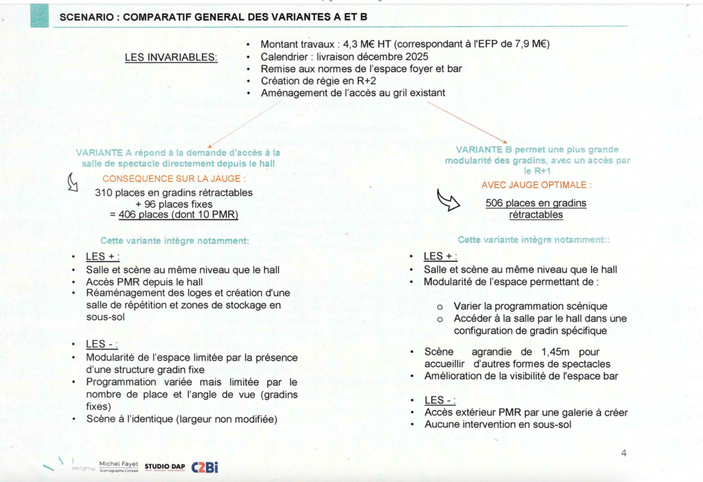 Le choix de la variante A a été fait dans un souci d’économies avec des espaces sont optimisés. Ce choix n’est fait ni en conseil d’administration du théâtre des sources, ni en conseil municipal.