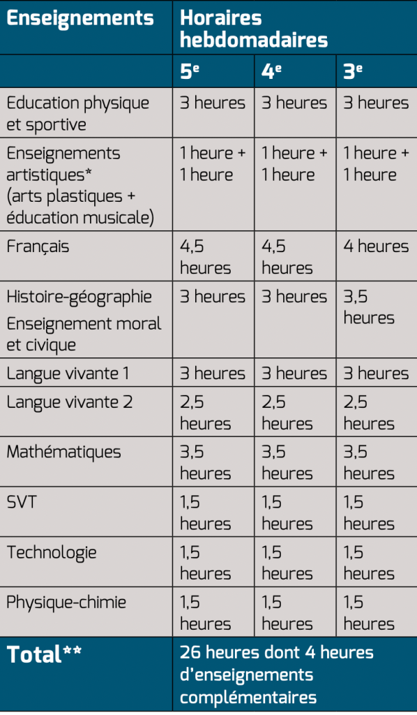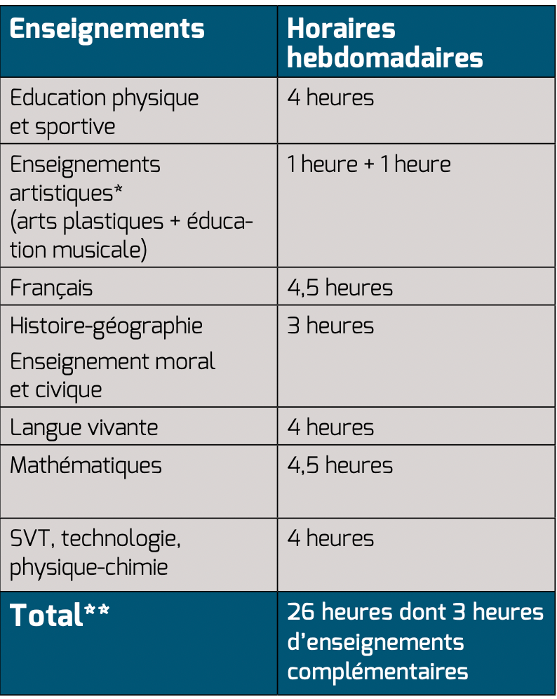 L’horaire hebdomadaire total pour les élèves de sixième est de 26 heures, incluant 3 heures d’enseignements complémentaires (enseignements pratiques interdis-ciplinaires et accompagnement personnalisé). Il faut ajouter à cet horaire 10 heures annuelles de vie de classe.
