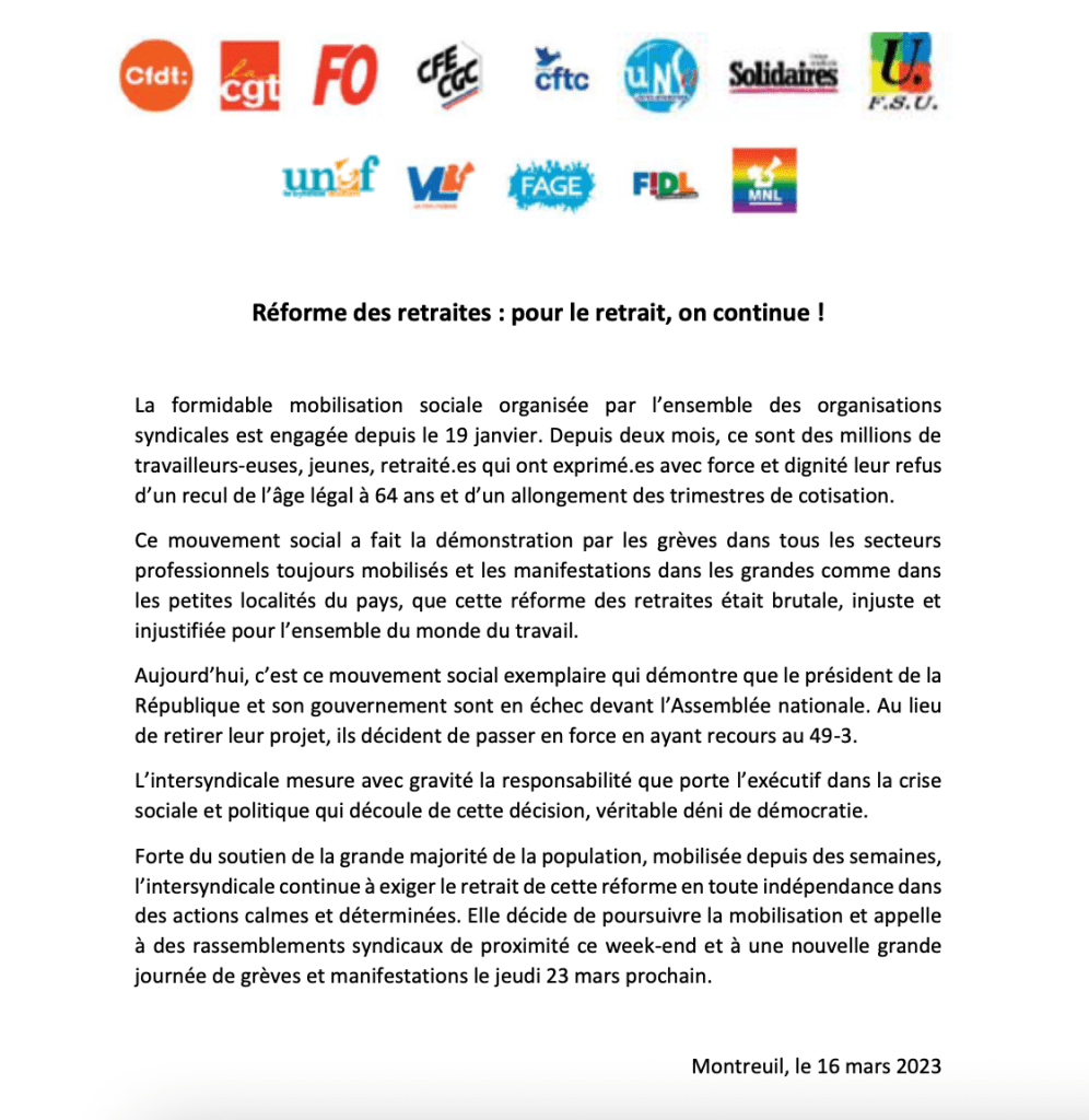 Les manifestations contre les retraites se multiplient parce qu’il y a une hostilité contre cette réforme des retraites, mais aussi à cause de la façon dont cette réforme se déroule, via le 49-3 et donc l’absence de débat.