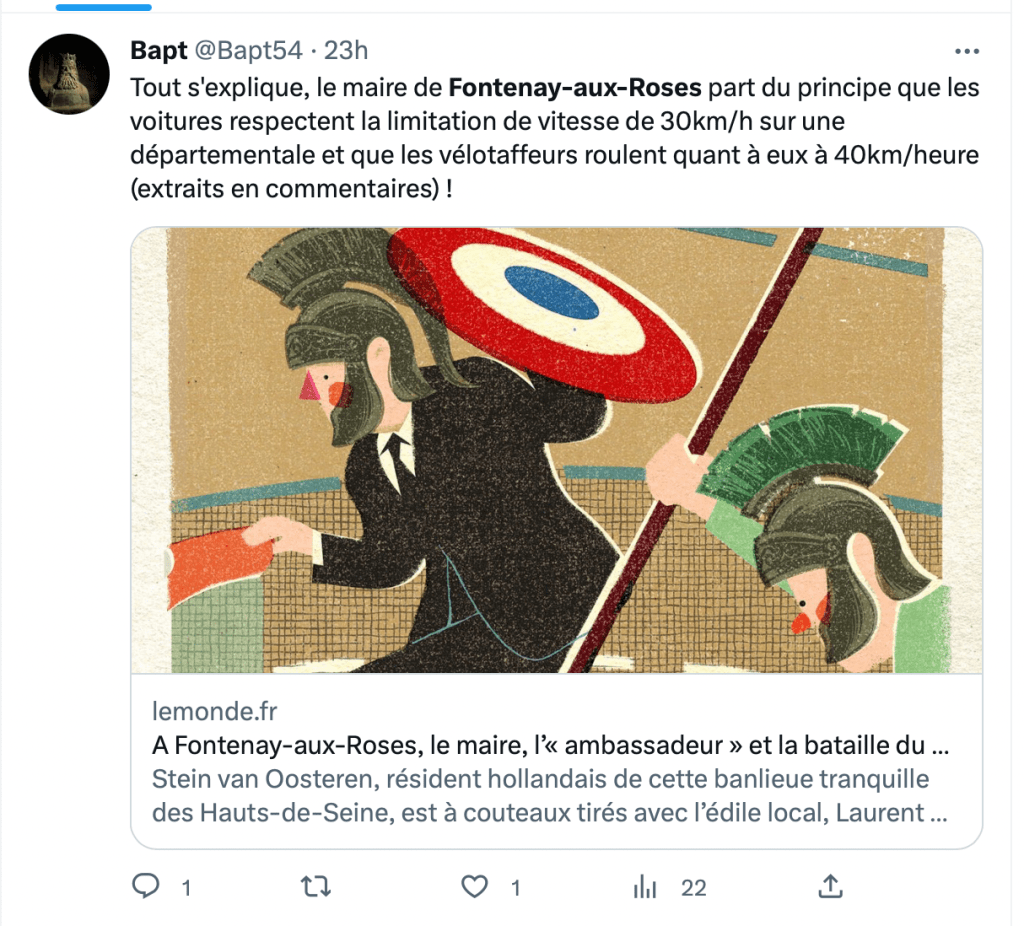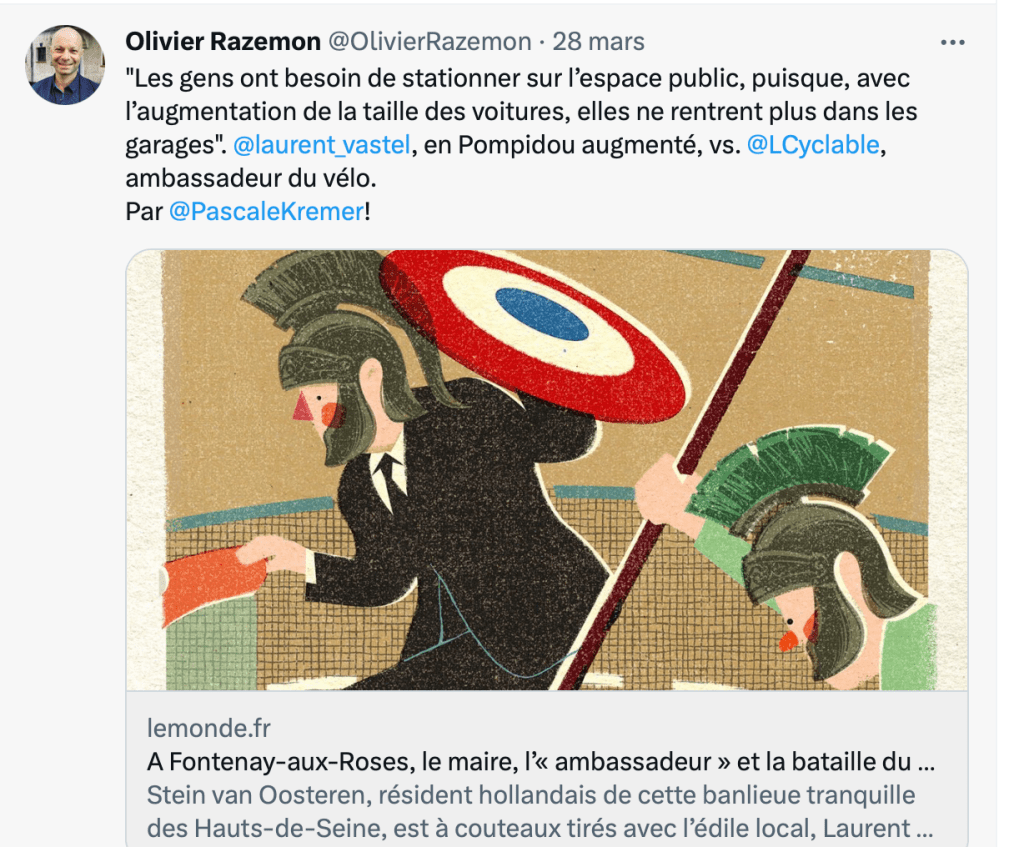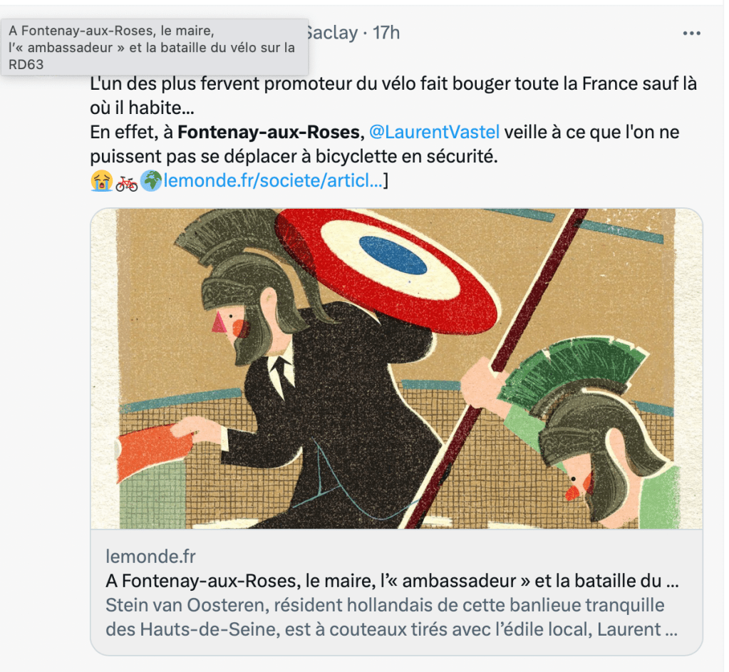 Un paradoxe à Fontenay-aux-Roses : un habitant est expert sur le vélo et conseille plusieurs élus, toutes tendances confondues partout en France, et une ville qui refuse le RER V de la Région, le schéma départemental cyclable voté par le Département (et financé par lui), ainsi que celui du territoire VSGP.