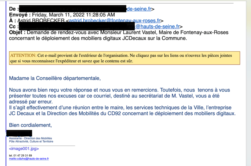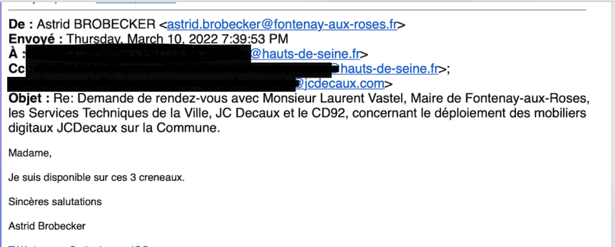 Le 10 mars 2022, Astrid Brobecker, conseillère départementale a reçu un mail lui proposant une réunion avec la direction des mobilités du département, les services techniques de la ville, le maire et JCDecaux concernant le déploiement des mobiliers urbains sur la commune :