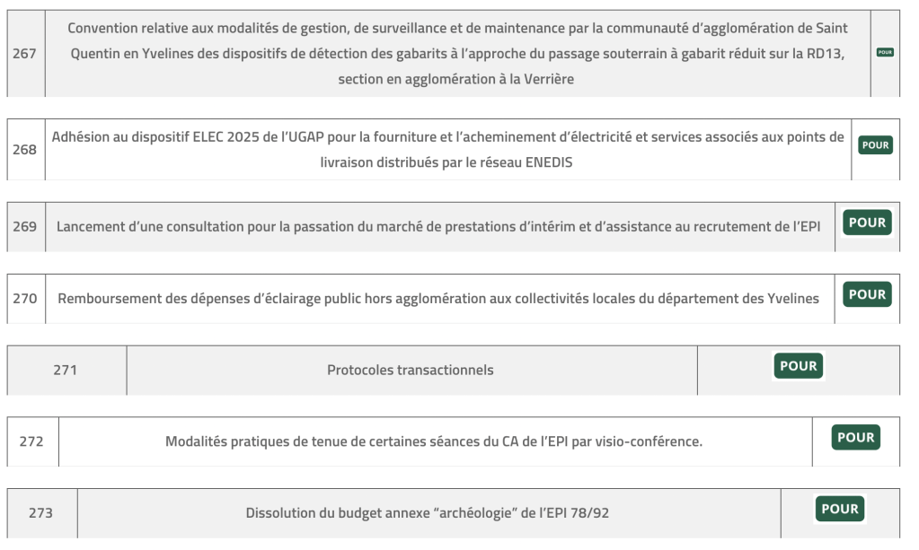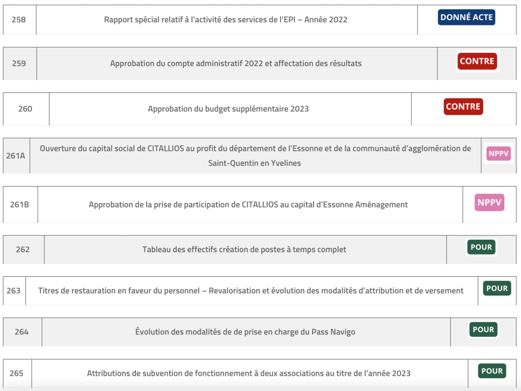 - Nous nous sommes abstenus sur l‘ouverture du capital social de CITALLIOS au profit du département de l’Essonne et de la communauté d’agglomération de Saint-Quentin en Yvelines, la prise de participation de CITALLIOS au capital d’Essonne Aménagement et sur le lancement d’une consultation pour la passation du marché de prestations d’intérim et d’assistance au recrutement de l’EPI.