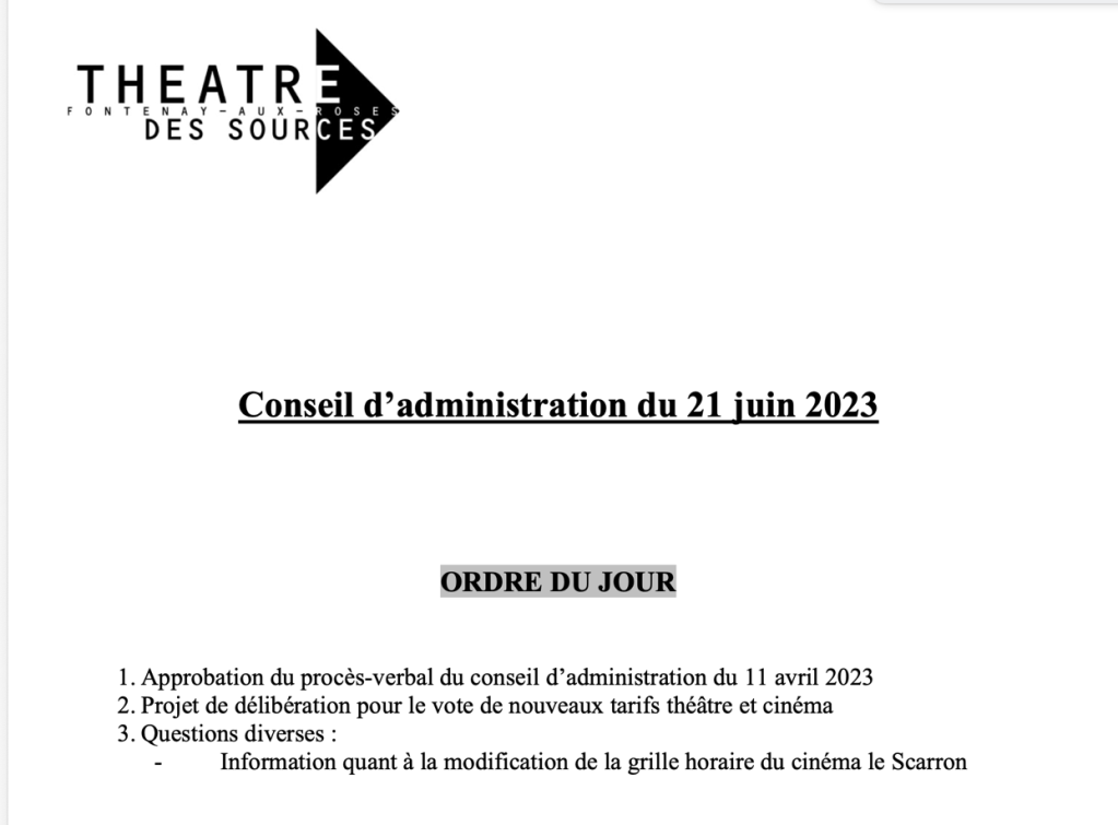 La fermeture du cinéma 3 jours (lundi, mardi et jeudi) n’était pas à l’ordre du jour du conseil d’administration du Théâtre des sources-Cinéma Le Scarron du 21 juin 2023, mais en question diverse avec mention suivante : « Information quant à la modification de la grille horaire du cinéma le Scarron », qui pouvait laisser croire qu’il s’agissait d’un changement horaire des séances.