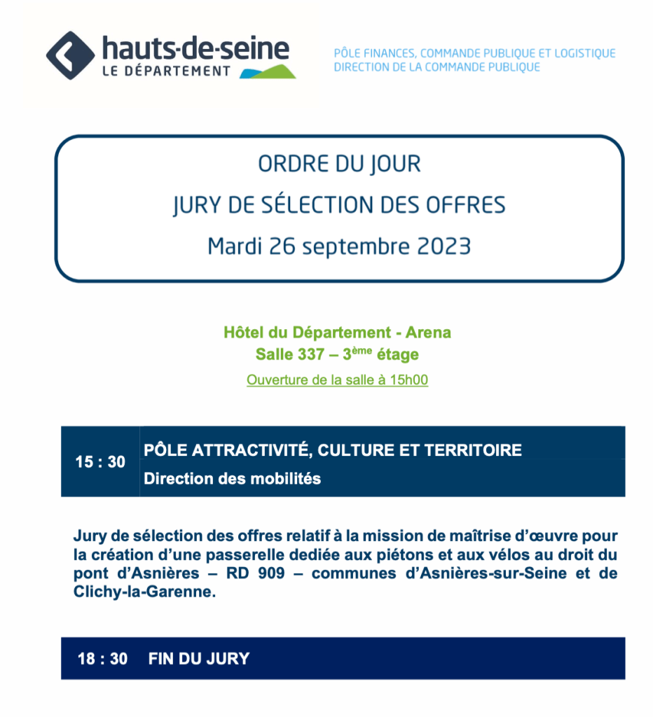 Je participerai au jury de sélection des offres relatif à la mission de maîtrise d’œuvre pour la création d’une passerelle dédiée aux piétons et aux vélos au droit du pont d’Asnières (RD 909) sur les communes d’Asnières-sur-Seine et de Clichy-la-Garenne.