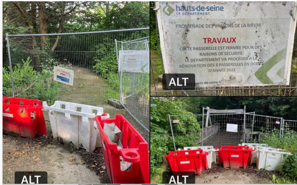 Sur le secteur de Fontenay-aux-Roses, la promenade des vallons de la Bièvre est équipée de trois passerelles en bois dont l’une est effectivement fermée depuis un peu plus de deux ans pour des raisons de sécurité. Depuis la fermeture de cet ouvrage, un itinéraire provisoire permet le maintien de la circulation piétons et vélos dans ce secteur mais le flux piétons / cyclistes est important est accidentogène.