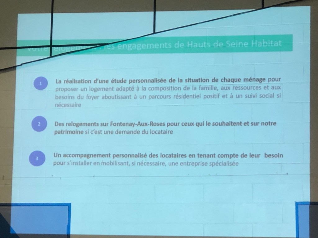 La réunion a commencé par l’intervention de Madame Mullard. La direction dont elle a la charge a été créée il y a 2 ans pour l’ensemble des locataires qui sont en difficulté sociale à cause de dettes, de situations de handicap, de vieillissement. Elle rencontre l’amicale des locataires tous les mois dans le cadre de l’opération de relogement et a des réunions à peu près tous les mois avec le maire.