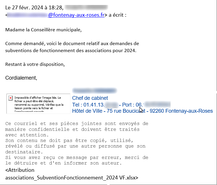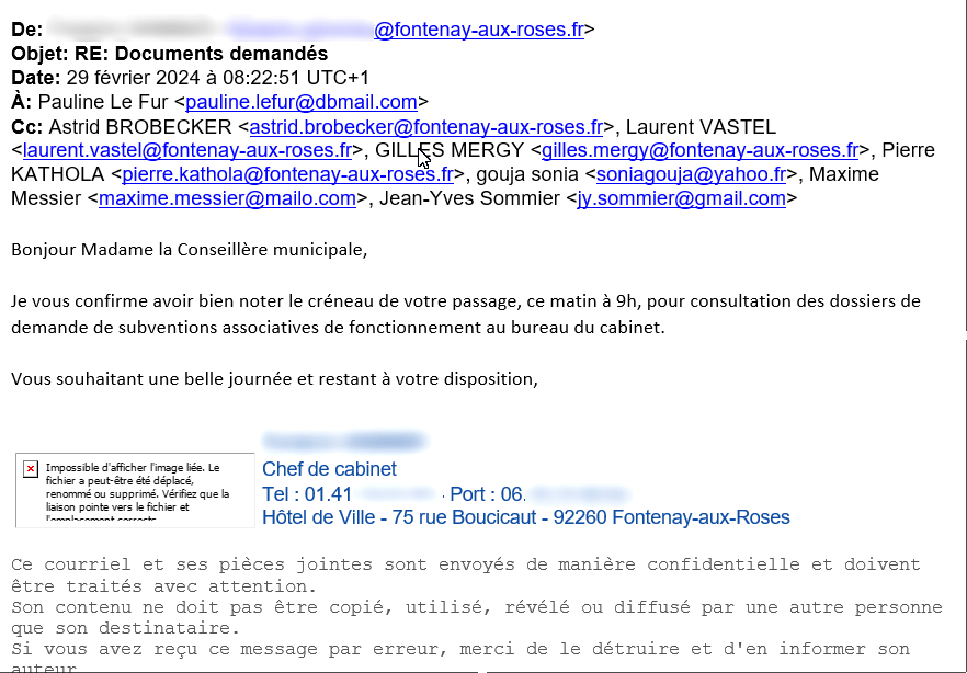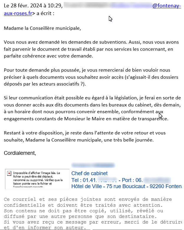 – Alors qu’on a eu 30 pages sur la compétence cimetière, et la ville de Villetaneuse, nous avions deux pages sur les subventions aux associations (à la différence des années précédentes ou nous avions les dossiers de demandes). Plusieurs élus de l’opposition Pauline Le Fur, Gilles Mergy, Maxime Messier, Jean-Yves Sommier et moi avons demandé à avoir accès aux documents relatifs aux demandes de subventions (demandes, refus) , demande réceptionnée par le cabinet lundi 26 février matin.