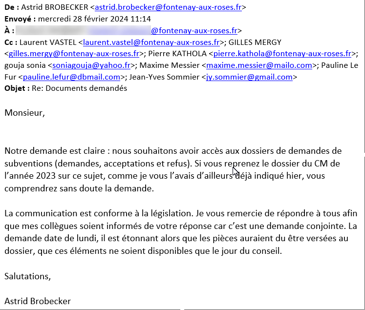 Nous avons répondu 3 heures après le 27 au soir, « Je vous joins ma demande initiale du 24/02, que vous avez du recevoir, lundi 26/02 au matin : avoir accès à toutes les demandes (acceptées et refusées) de subventions.