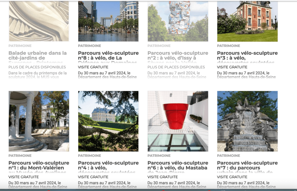 Forte de son succès l’année dernière, le département des Hauts-de-Seine organise, en lien avec, Cocyclette, la découverte du patrimoine des Hauts-de-Seine, à travers 10 parcours « vélo-sculpture » (5 par weekend).