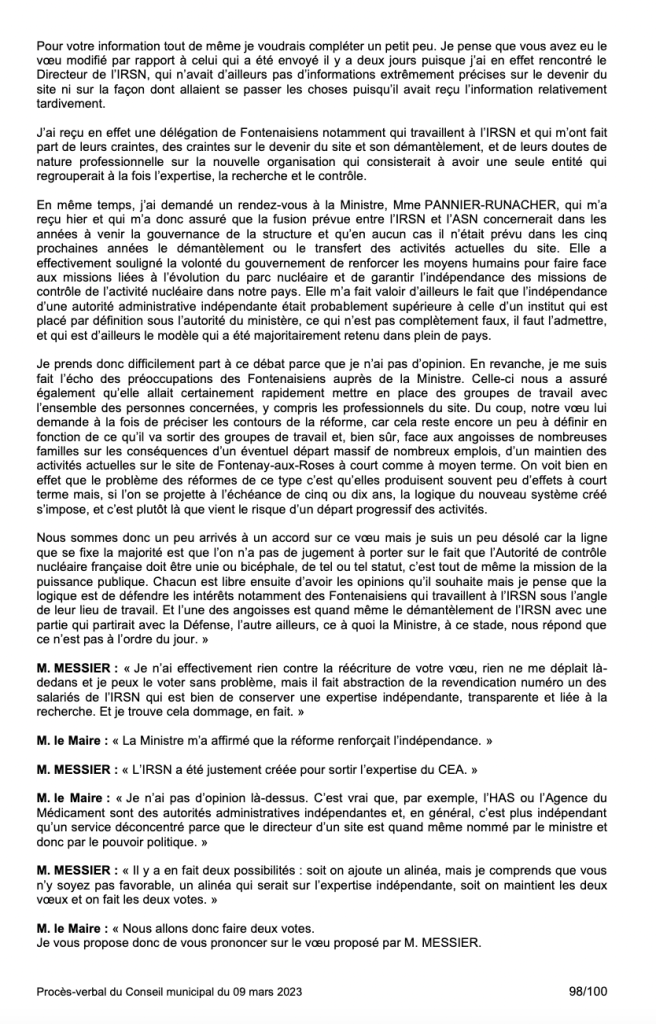 Nous avons soutenu les salariés de l’IRSN à travers des manifestations auxquelles nous nous sommes rendus et à travers un voeu que nous avons proposé en conseil municipal de mars 2023, et qui a été rejeté par la majorité, le maire indiquant que « la ministre m’a affirmé que la réforme renforçait l’indépendance ».