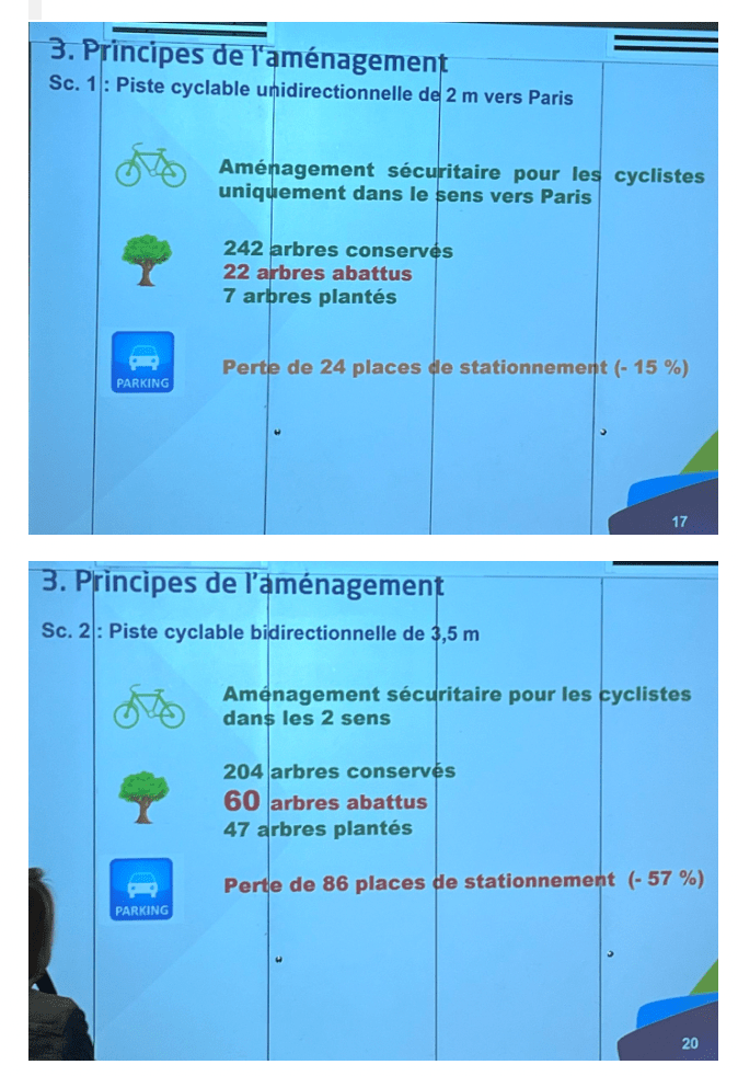 3 scénarios ont été proposés, avec nombre de stationnement supprimés, et nombre d’arbres abattus) par le département :
