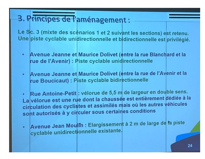 Le maire a indiqué « Le projet relève du Département, pas de moi, je dois contenter tout le monde et ce projet est un bon compromis ». Or, pour rappel, la piste bidirectionnelle dans les deux sens est conforme au schéma départemental du Département, ainsi que celui du VIF de la Région, qui ont identifié la RD63 comme un axe stratégique.