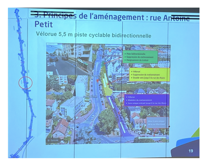 - – « Sur la rue Antoine Petit, on a compris que le terme vélo rue n’est pas forcément clair pour tout le monde et qu’il y a une crainte au niveau de la vitesse dans le sens de descente de vélo avec des craintes des riverains qui vont sortir leur voiture »