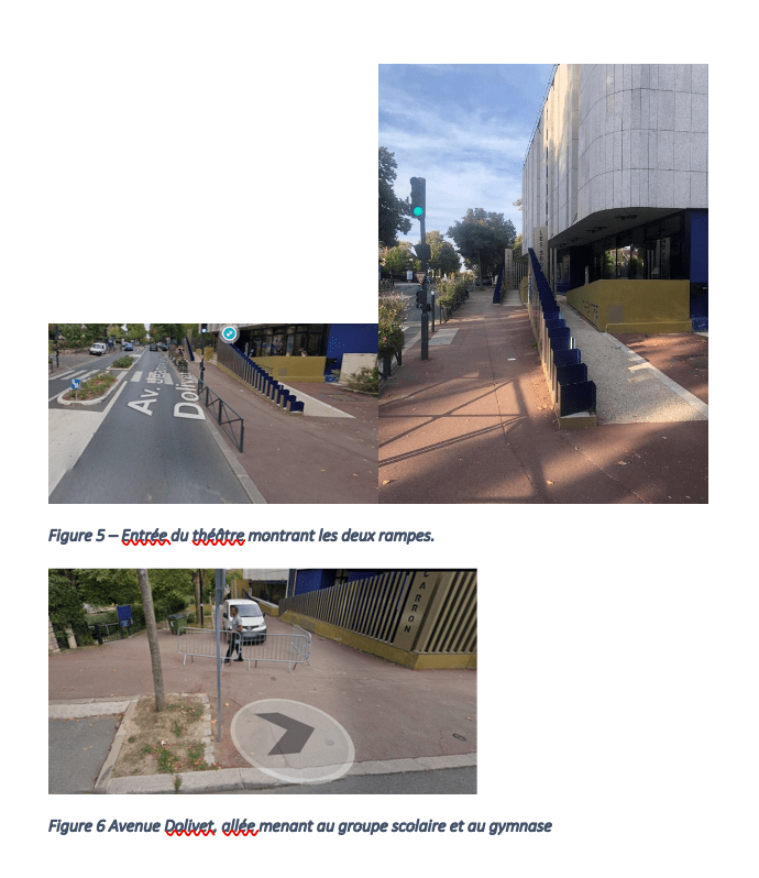 Devant le théâtre des sources, il y en a deux rampes PMR, une pour le cinéma et une pour le théâtre, sachant que celle pour le théâtre permet d’accéder au cinéma, de l’intérieur comme de l’extérieur. La rampe la plus à gauche devrait pouvoir être enlevée (sans doute avec accord de l’architecte). De plus, il y a un terre- plein central qui permettrait de gagner encore un peu de largeur. Ce terre-plein, qui sert à ralentir les voitures, constitue une rupture cyclable car elle met les cyclistes (notamment enfants et seniors) dans une situation qui fait trop peur pour oser y rouler.