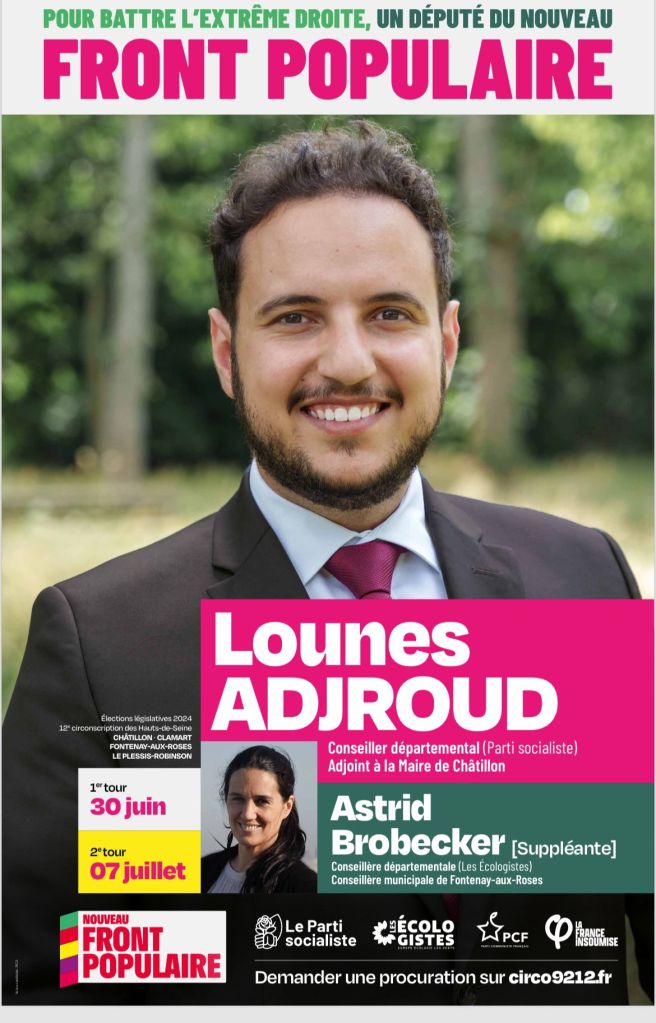 Lounes Adjroud est le candidat du #NouveauFrontPopulaire dans la 12ème circonscription des Hauts-de-Seine (Châtillon · Fontenay-aux-Roses · Clamart · Plessis-Robinson) pour battre l’extrême droite et porter votre voix au cœur de l’Assemblée nationale.