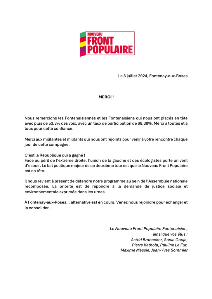 Communiqué de presse du Nouveau Front Populaire de Fontenay-aux-Roses Partager : Cliquer pour partager sur X(ouvre dans une nouvelle fenêtre) X Cliquez pour partager sur Facebook(ouvre dans une nouvelle fenêtre) Facebook J’aime chargement… Articles similaires