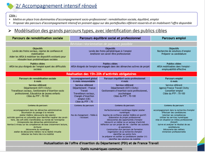“Le dispositif d’accompagnement global a pour objectif de favoriser l’accès à l’emploi des allocataires du RSA et demandeurs d’emploi confrontés à des difficultés sociales et professionnelles. Il se traduit par un diagnostic partagé et la mise en œuvre d’un accompagnement individualisé et intensif par un binôme de professionnels du Conseil départemental et de France Travail. La file active cible au titre de l’accompagnement global est de 2000 demandeurs d’emploi sur le territoire des Hauts-de-Seine.”