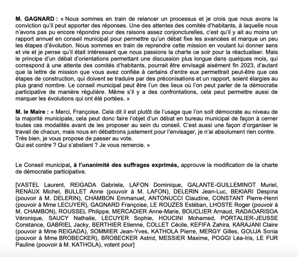 Demain aura lieu un apéro thématique sur la démocratie participative, voici un extrait sur le débat municipal à propos de charte.