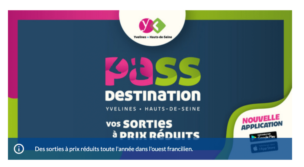 Il offre 15 % de réduction minimum sur les entrées ou les billets de près de 100 sites et évènements partenaires dans les Hauts-de-Seine et les Yvelines. Il permet de faire bénéficier de réductions aux familles ou aux amis jusqu’à 5 personnes au total.