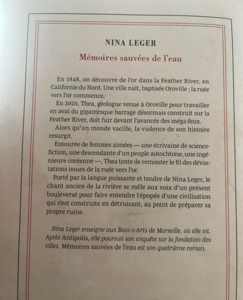 Le regard de Thea, une géologue confrontée aux répercussions modernes de la ruée vers l’or (le déplacement et l’assassinat des amérindiens, la destruction de la nature) ainsi que sa correspondance avec sa grand-mère et les apports d’une autrice de science-fiction. Un livre de femmes, en 1848, sans western… Une critique de l’Occident actuel qui questionne la notion de progrès et ses implications destructrices sur le monde.