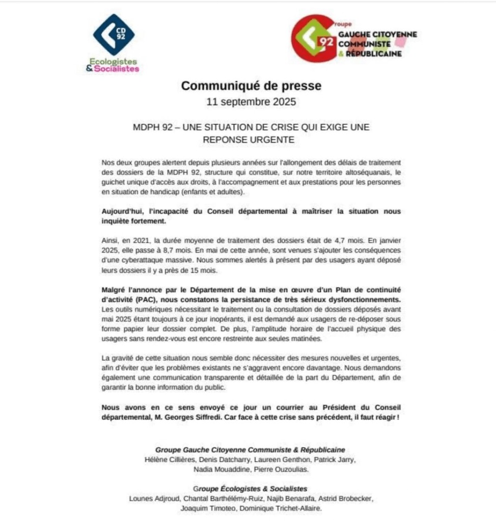 Dans ce contexte, nous, élu·es des groupes Écologistes & Socialistes et Élus 92 – Gauche Citoyenne, Communiste et Républicaine avons adressé un courrier au Président du Conseil Départemental et publié un communiqué de presse conjoint.